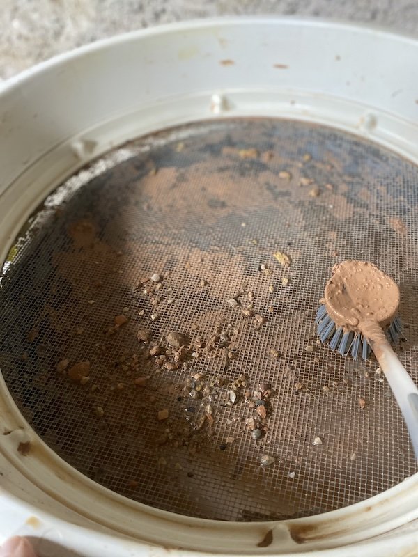 Le tamisage peut s’effectuer grossièrement avec un tamis de maçon, ou un simple chinois de cuisine, ou plus fin (mesh 30, 60, 100 ou même 120 si vous souhaitez ne conserver que les particules les plus fines). Commencez toujours par un tamisage grossier, puis de plus en plus fin.