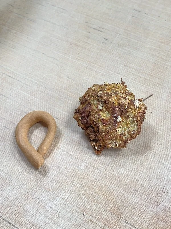 Avec l’expérience, il m’arrive de récolter des argiles qui sont peu plastiques sur le terrain, parce que je sais expliquer le manque de plasticité constaté par trop d’impuretés ou une réhydratation peu homogène par exemple. Un test alternatif consiste à essayer de former un mini-bol pincé sur le terrain, pour se rendre compte du comportement de l’argile : est-ce qu’elle se tient ? Est-ce que je peux la lisser ? Si je réponds favorablement, il peut m’arriver des récolter malgré un test de l’anneau peu concluant.